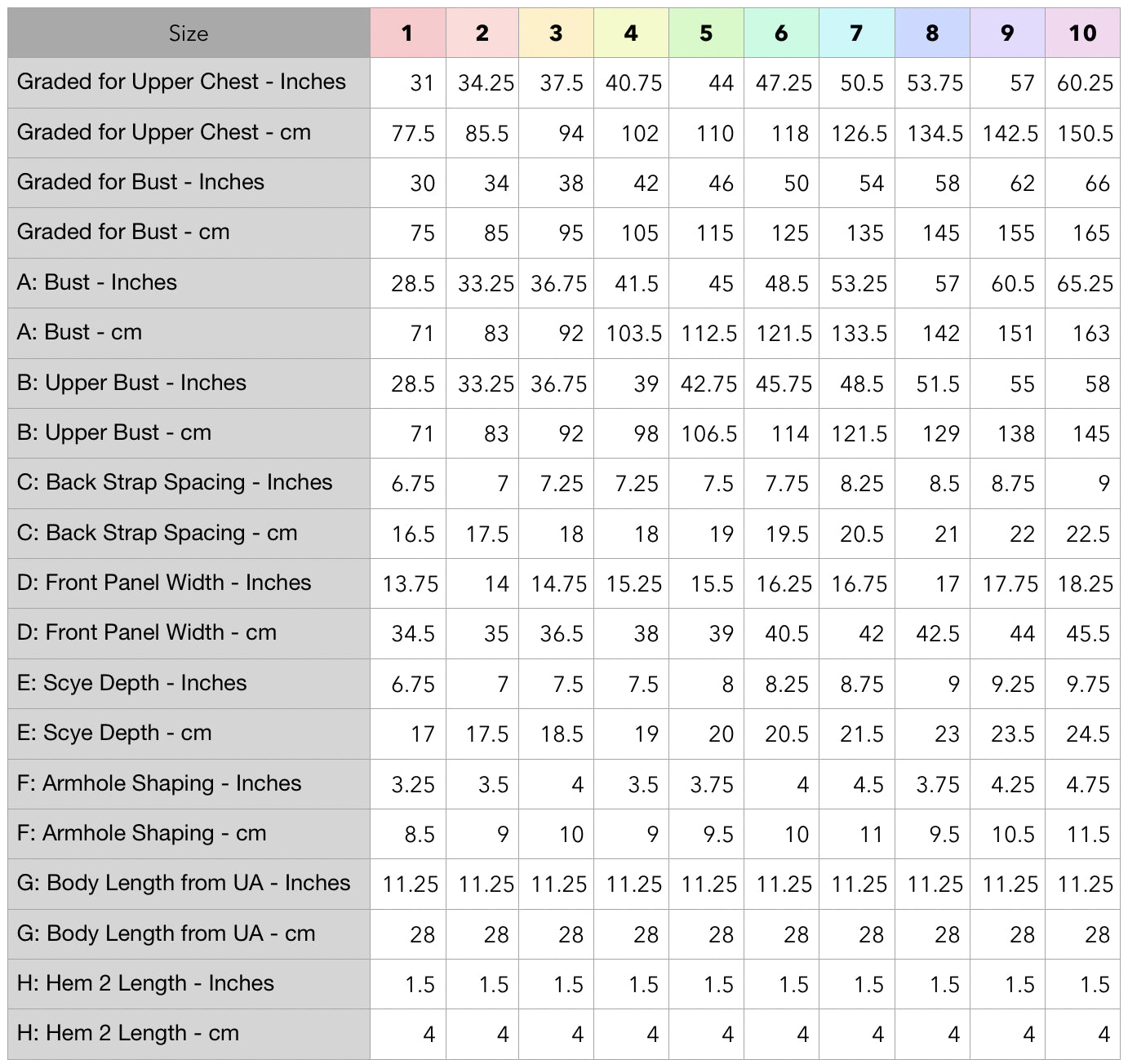 10 sizes, graded to fit a full bust of 30” to 66” / 75 cm to 165 cm.