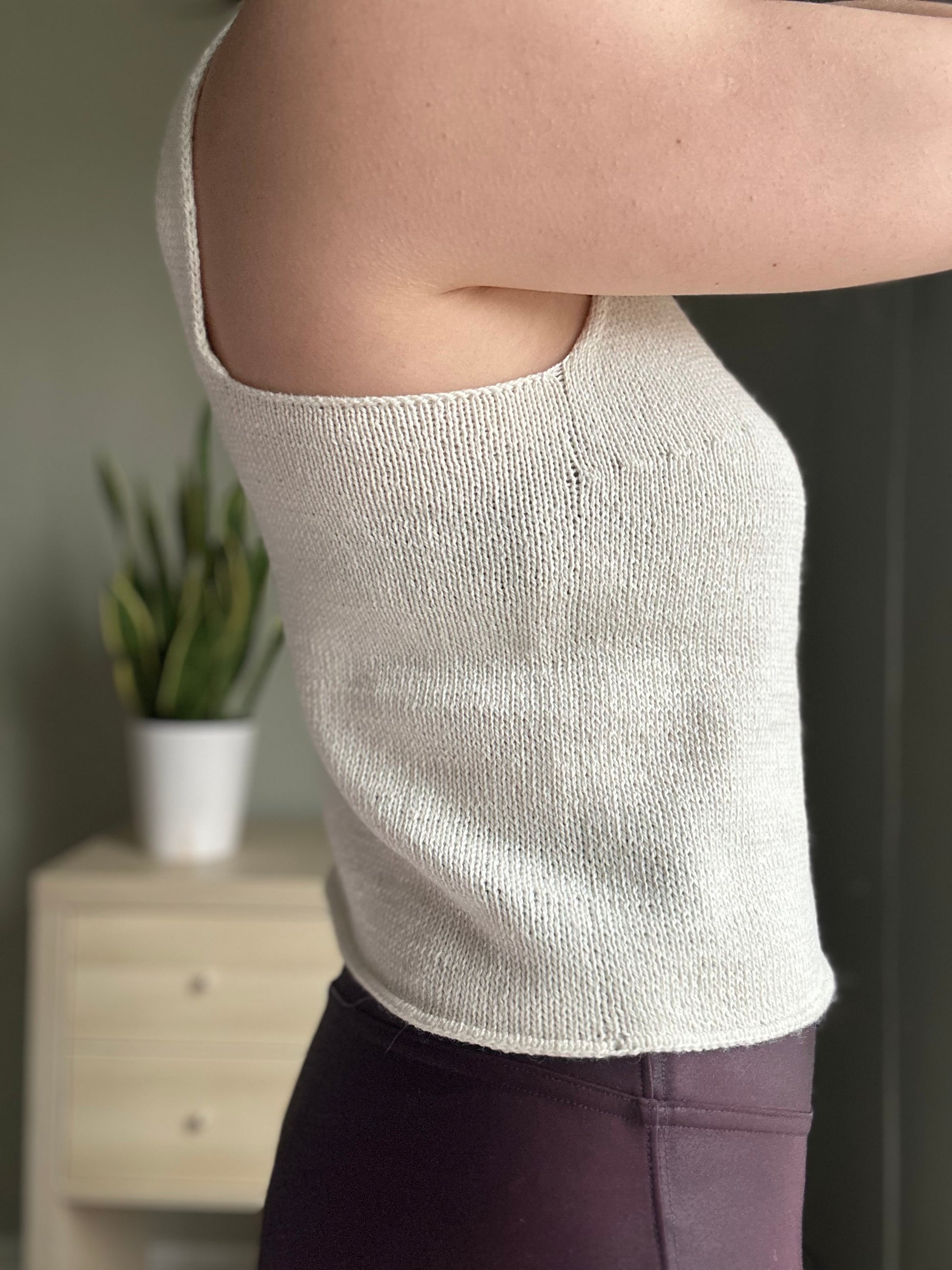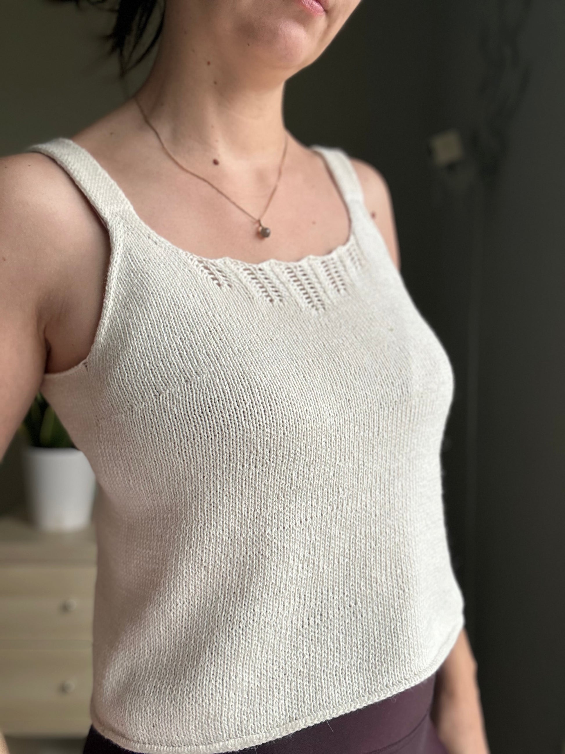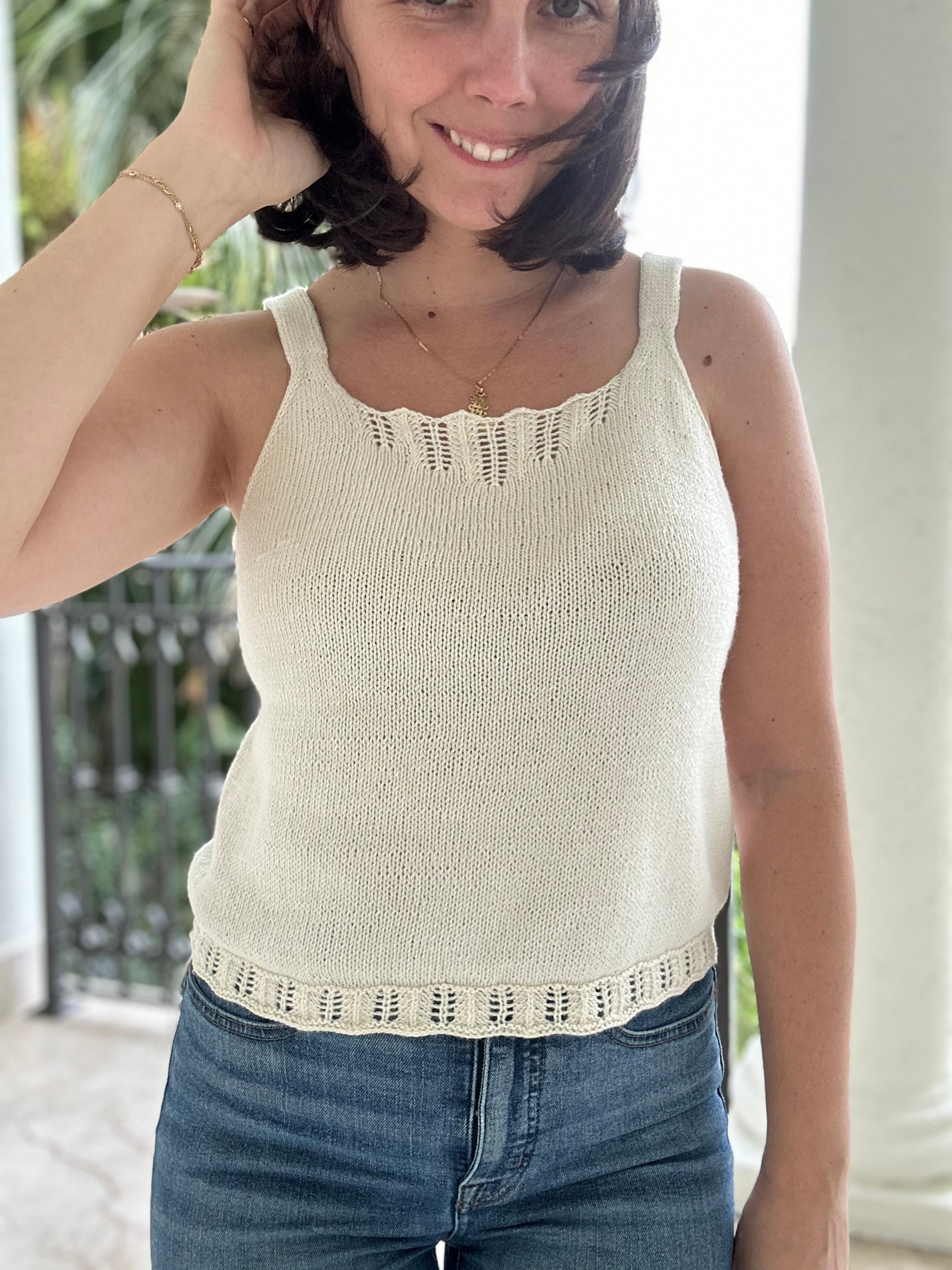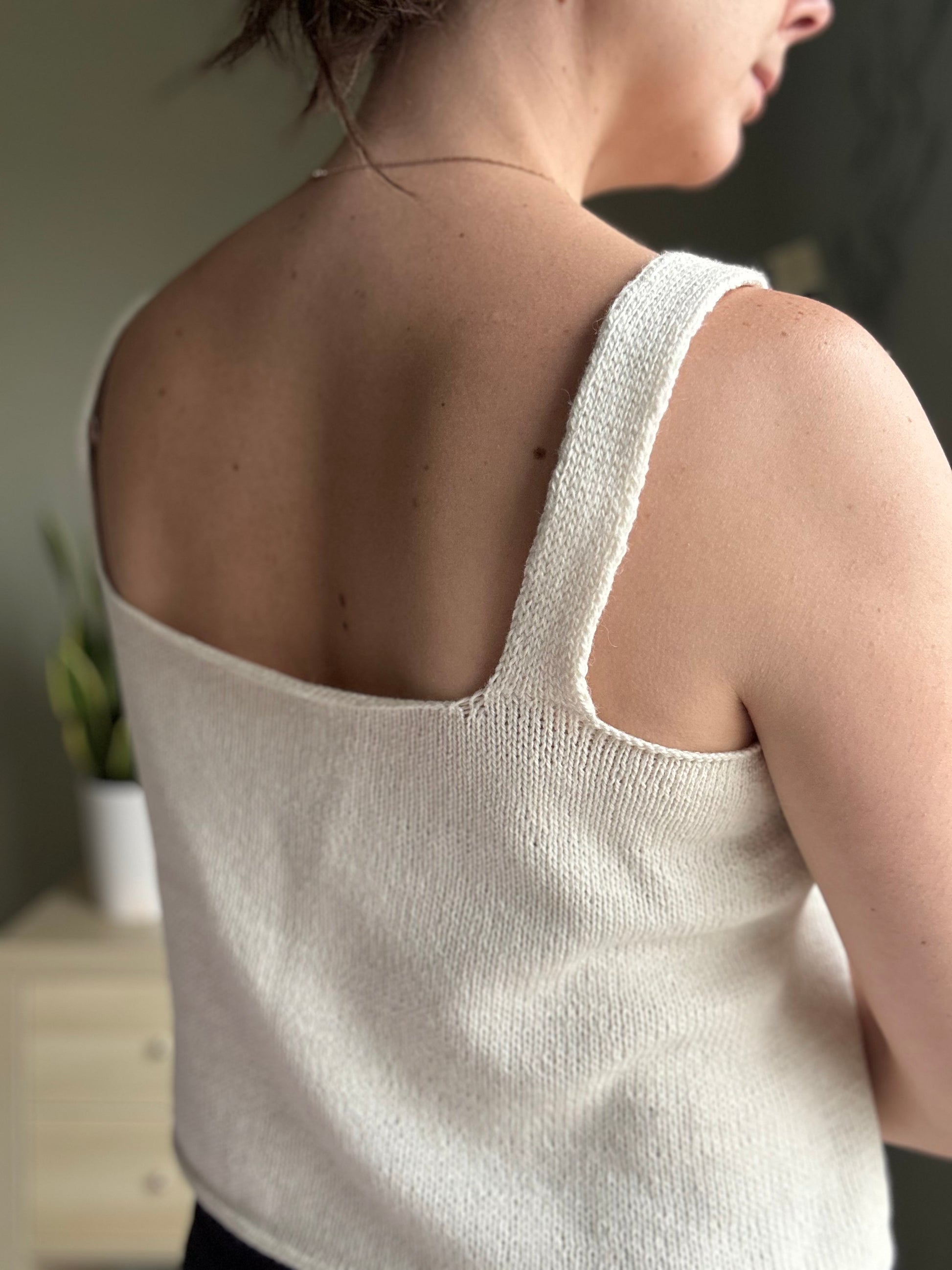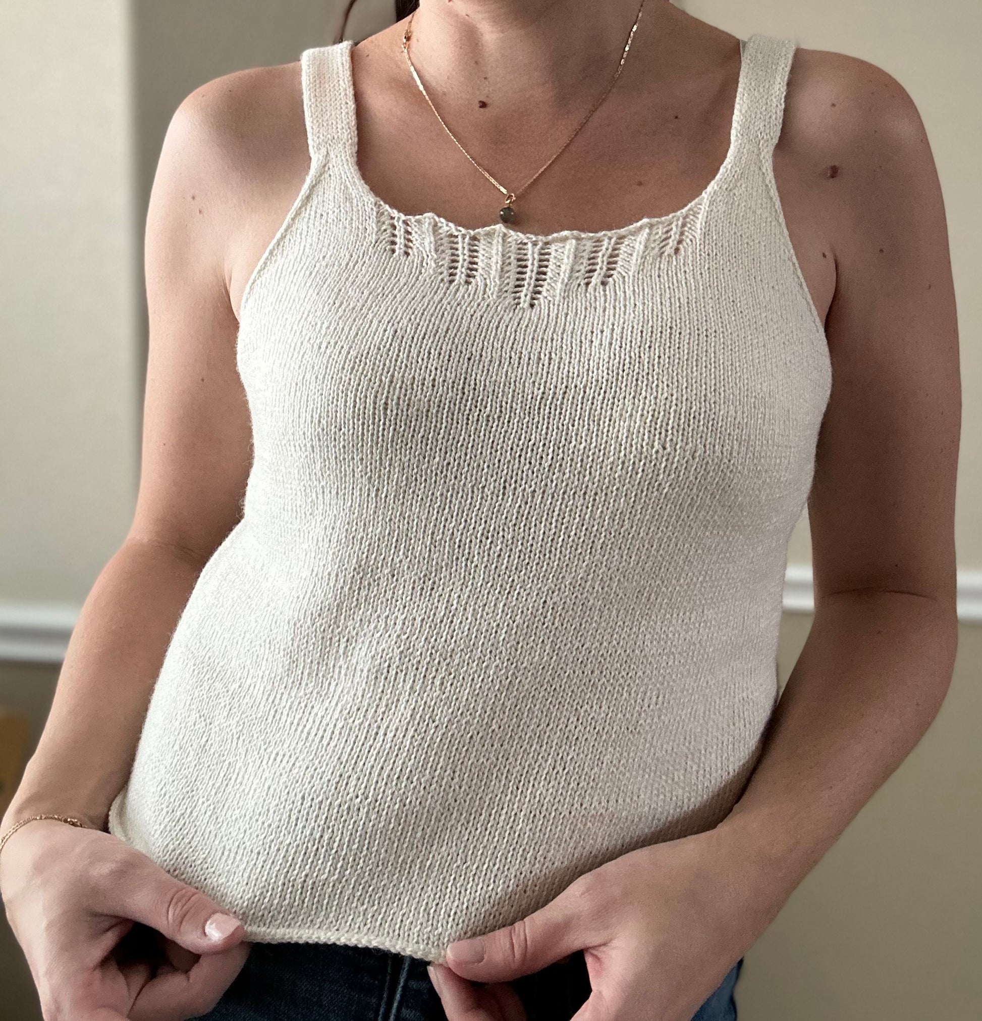 Camille is worked from the top down, with double knit straps that won’t roll or stretch out. The front panel is worked after the straps, and then the piece is joined in the round for smooth sailing stockinette.