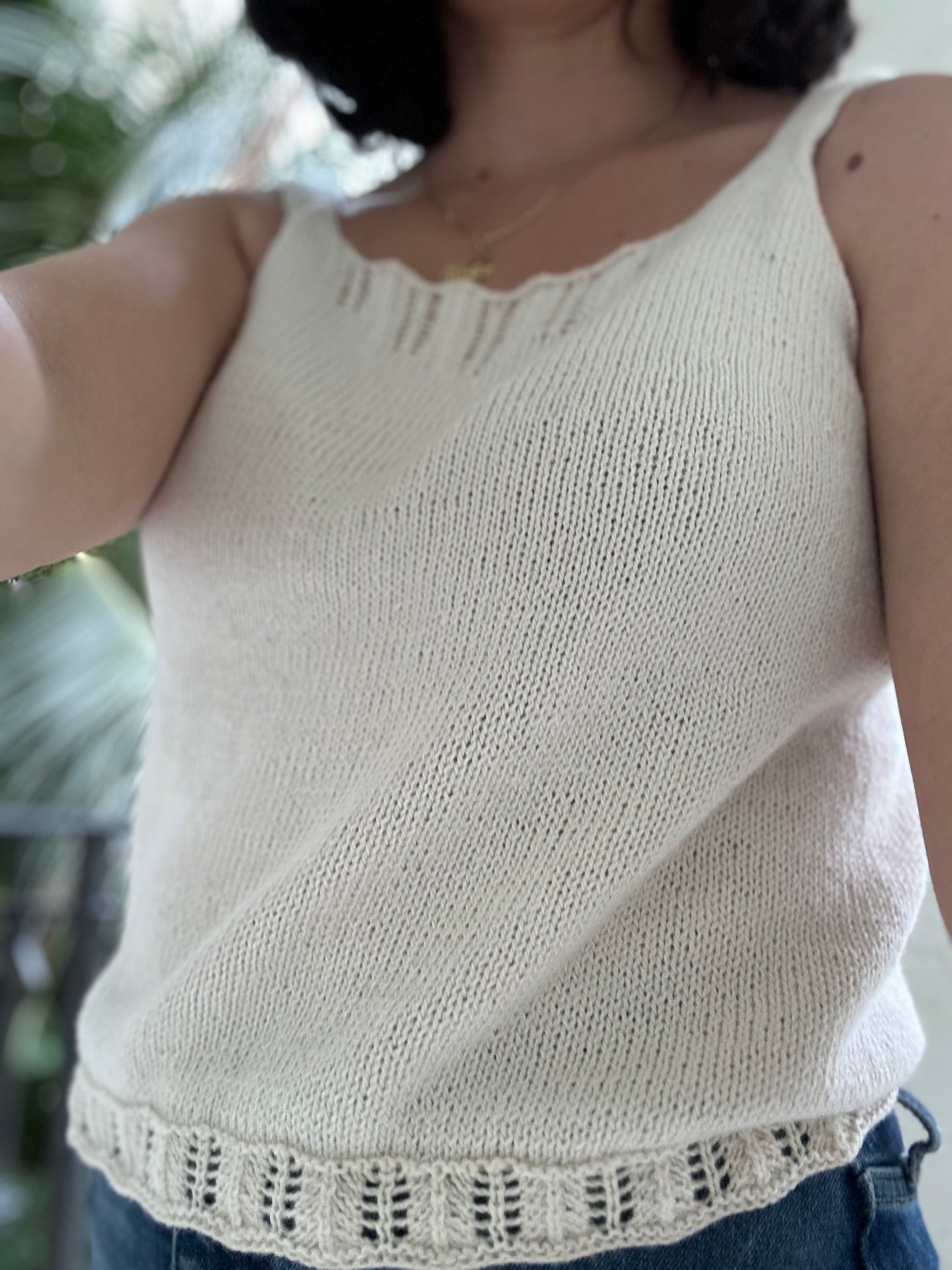 Hem 1 features a cute little tuck bind off for a discreet edge, perfect for tucking in. Hem 2 features the same pretty lace from the neckline, worked separately and attached with a 3 needle bind off. Cute when worn on its own, or peeking out from under a cardigan or sweater.
