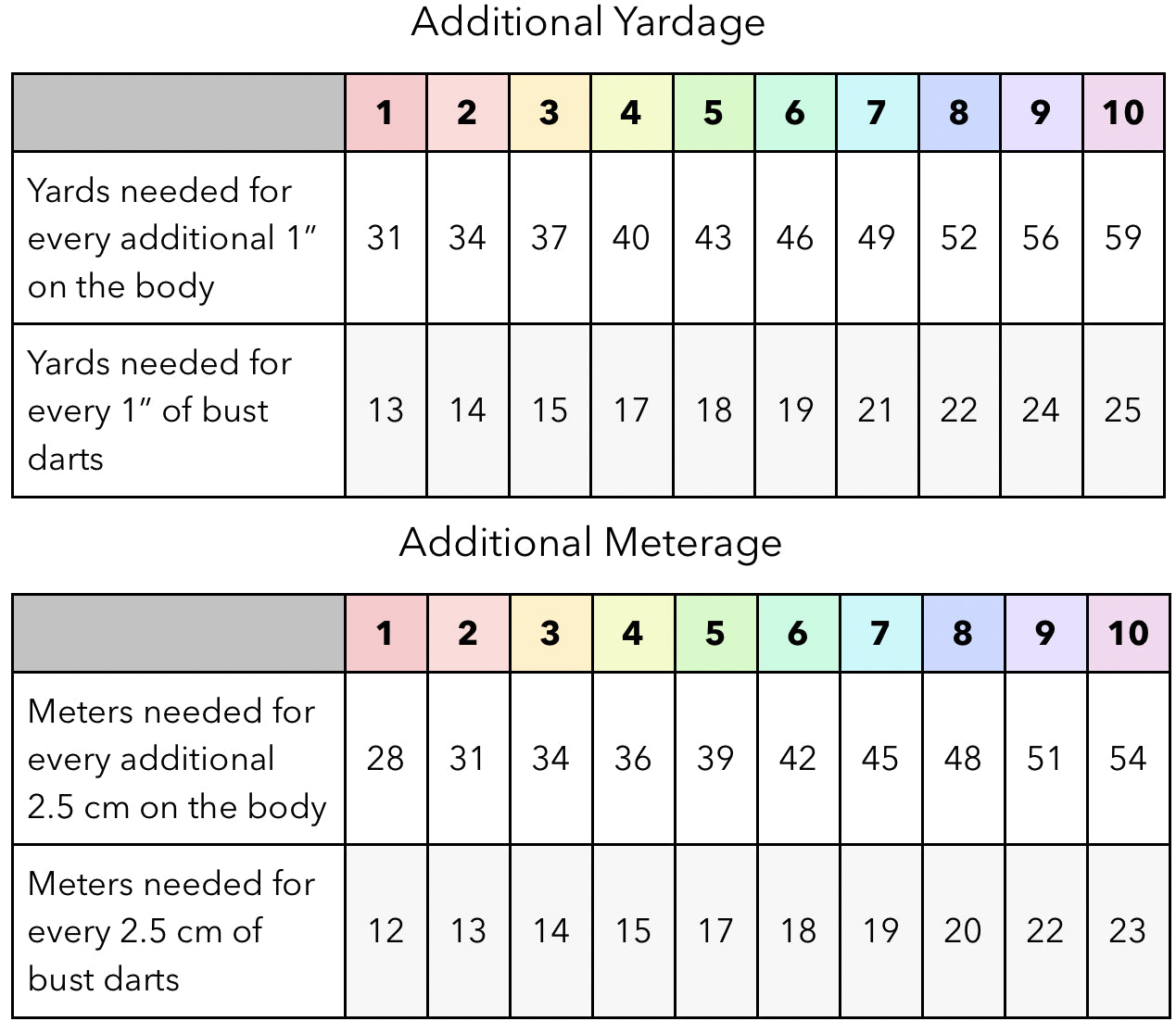 See photos for additional yardage needed if adding length to the body or adding bust darts.