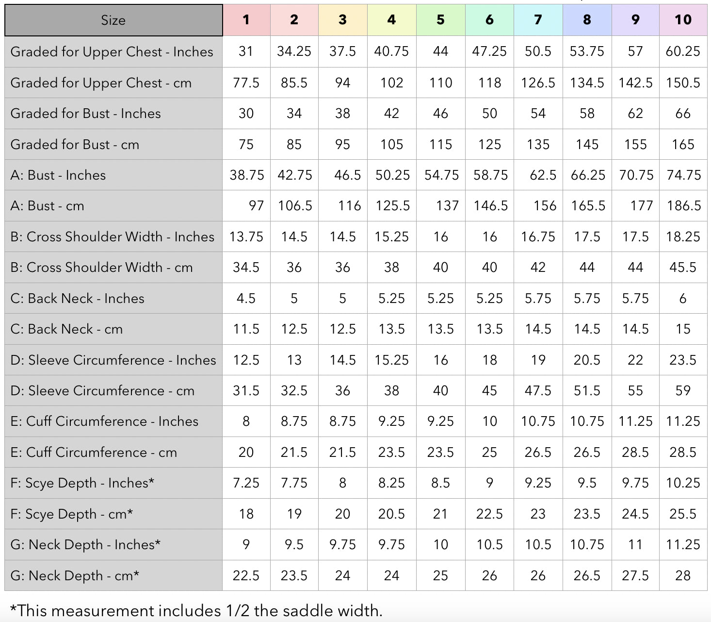Pattern comes in 10 sizes, which are intended to fit a 31”, 34.25”, 37.5”, (40.75”, 44”, 47.35”) {50.5”, 53.75”, 57”, 60.25”} / 77.5 cm, 85.5 cm, 94 cm, (102 cm, 110 cm, 118 cm) {126.5 cm, 134.5 cm, 142.5 cm, 150.5 cm} upper chest measurement