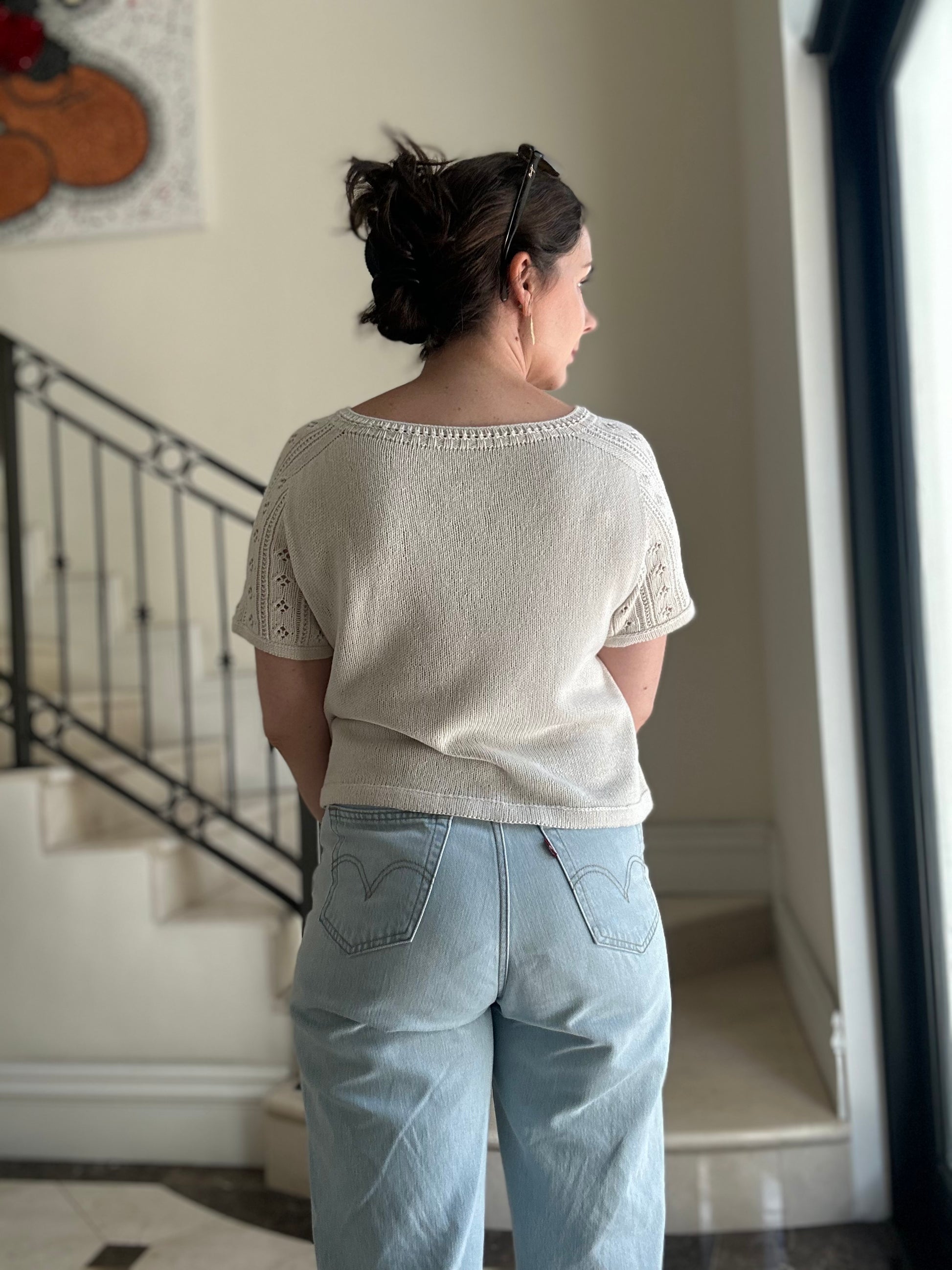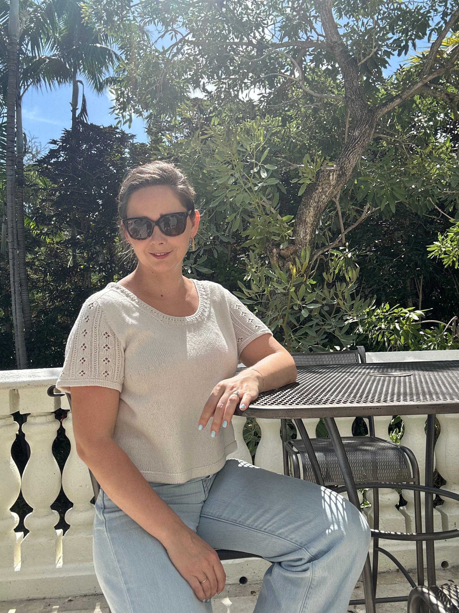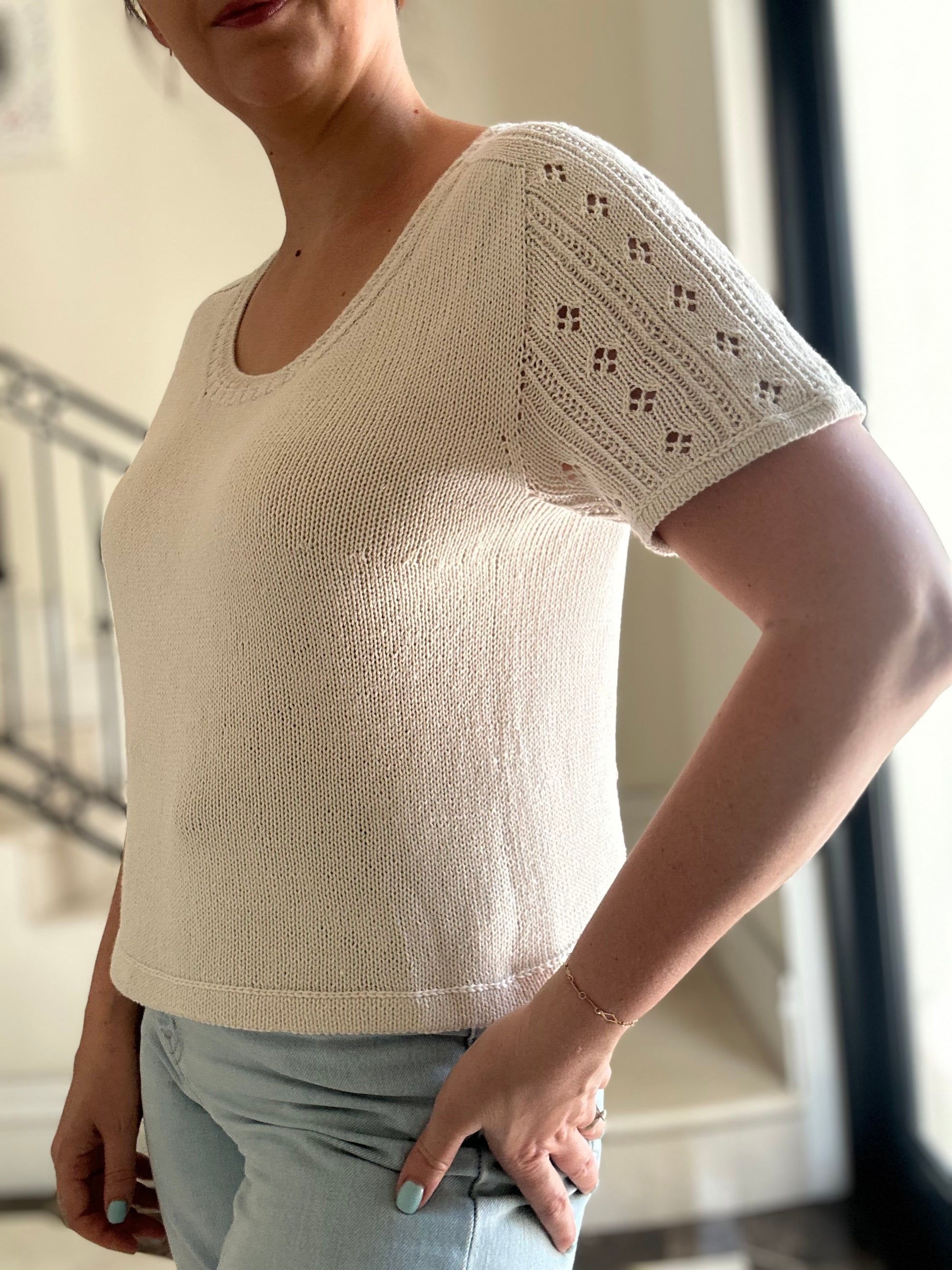 A few test knitters chose to use Knitting for Olive Pure Silk, which is a lovely alternative. Note that this yarn has little memory, so the tee is more prone to stretching out, particularly at the neckline. You may wish to size down, or be extra vigilant with gauge.