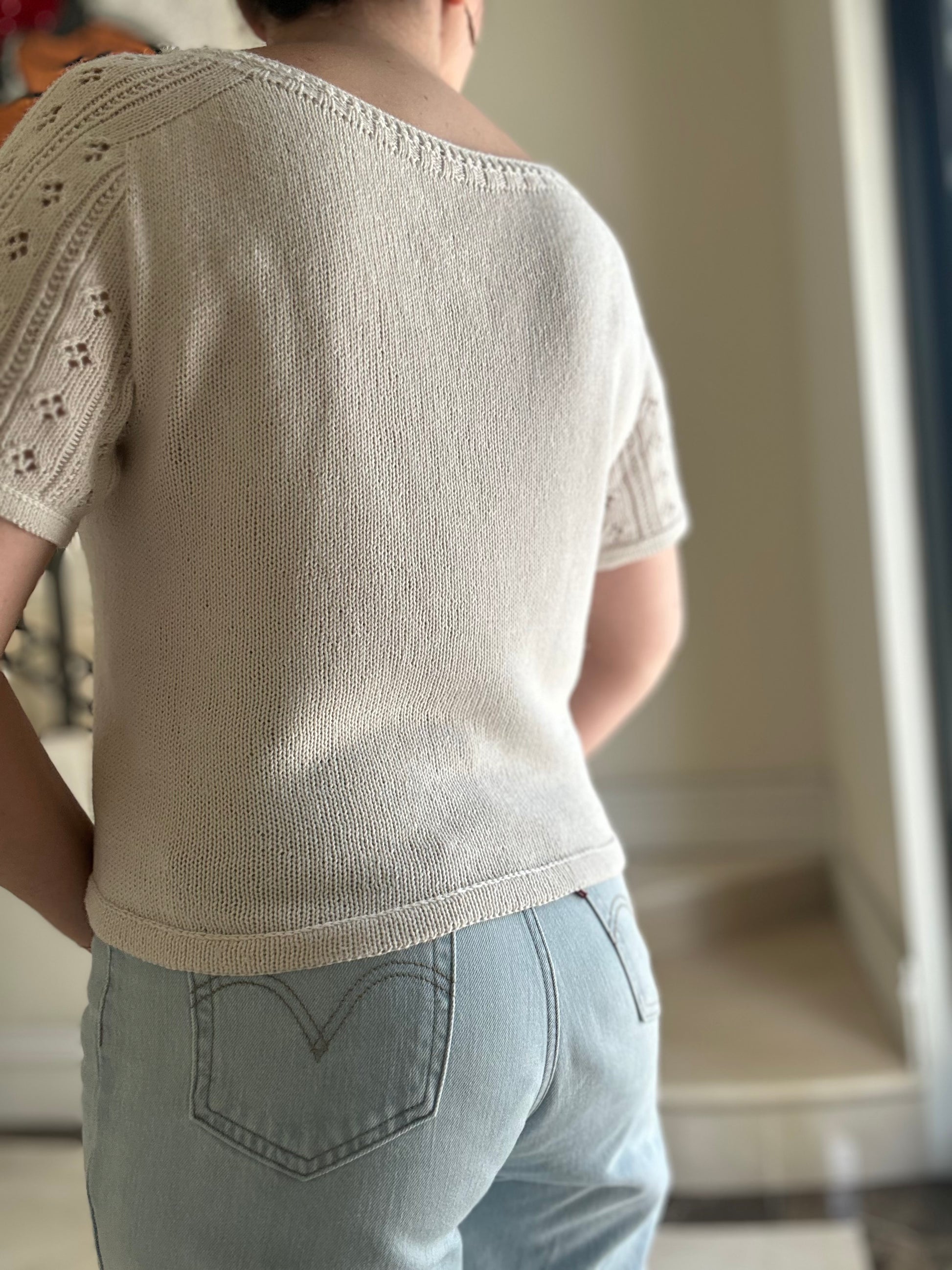 The Dain Tee knits up just like a raglan, with a silhouette closer to that of a saddle set-in sleeve. Worked top down seamlessly, you start by increasing for the shoulders, then start shaping the sleeves, body, and neckline. The neckline is joined, and the remainder of the yoke is worked in the round. Sleeve stitches are placed on hold while the body is finished, then stitches are picked up from the underarm to supplement the held stitches, and the sleeves are continued in lace. The body and sleeves are finished with a folded hem, which is attached to the main fabric with a crochet hook for a decorative element. Stitches are then picked up around the neckline for the collar.