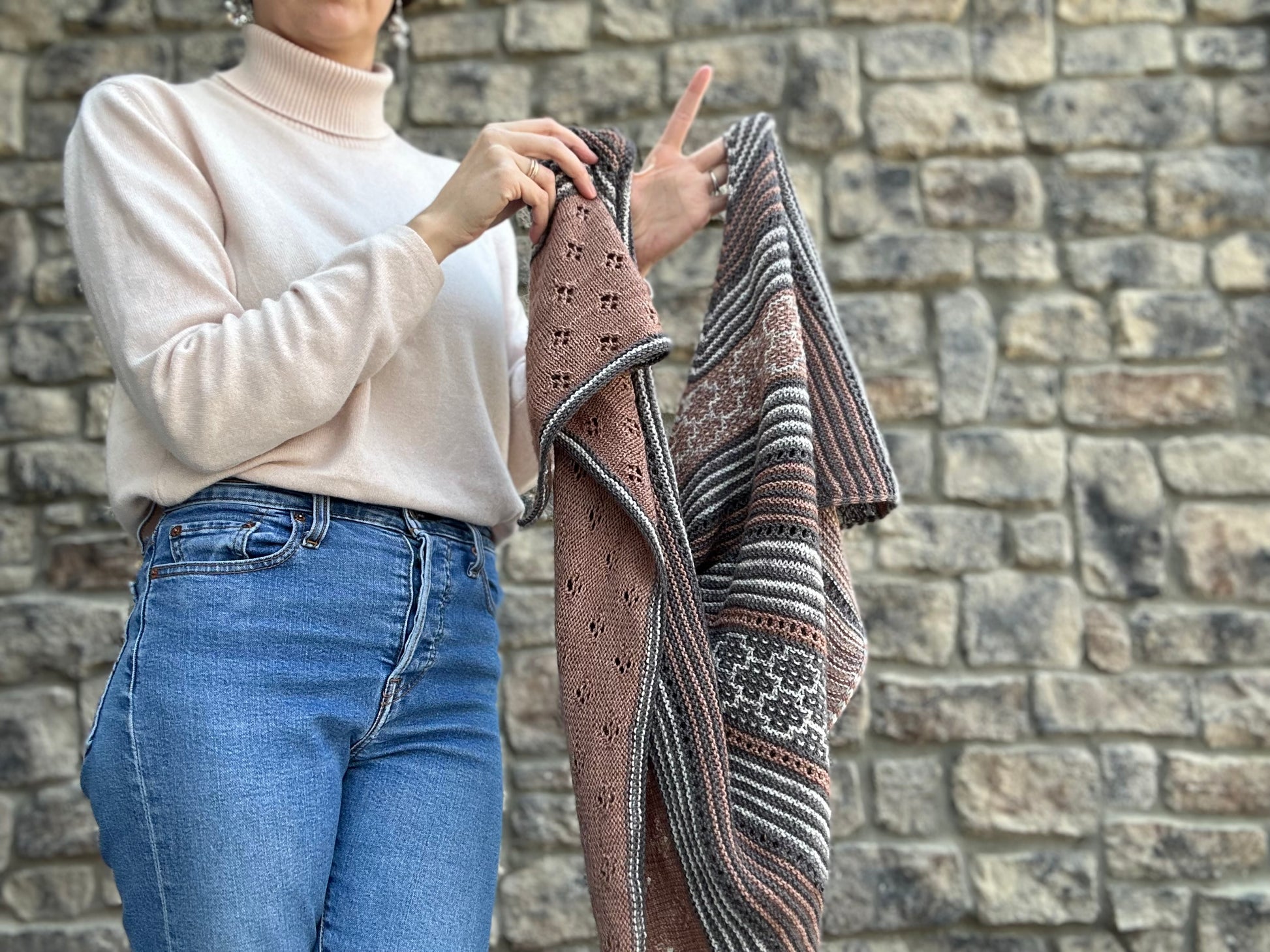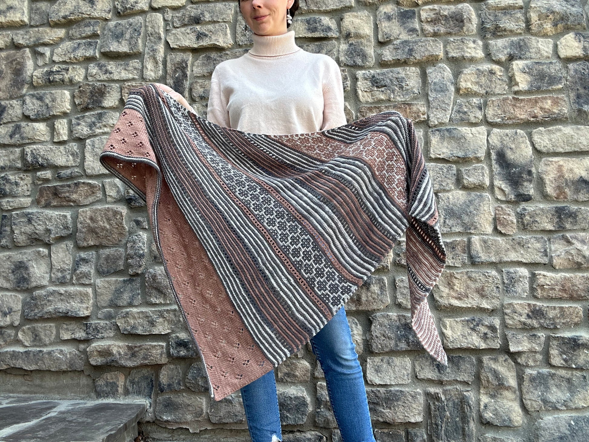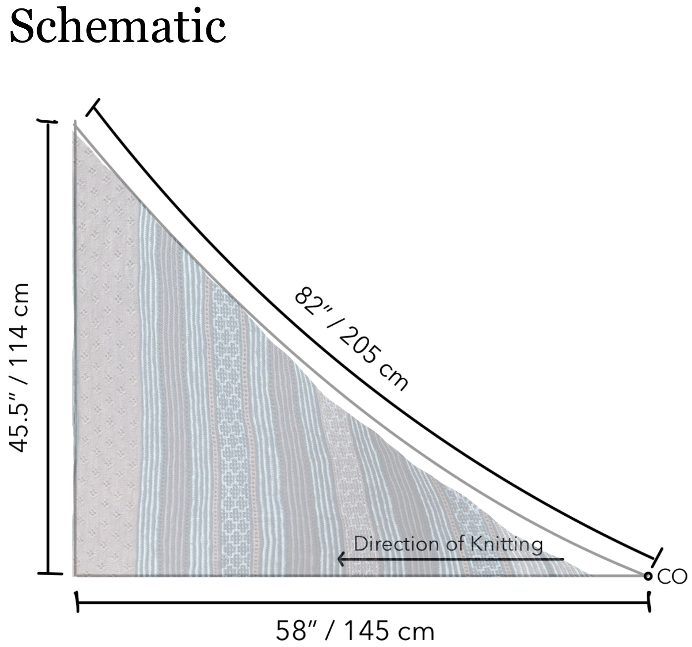 Construction: An asymmetrical triangle shawl, knit on the bias. Edges are knit as you go, so once you bind off, you’re done and ready for blocking!
