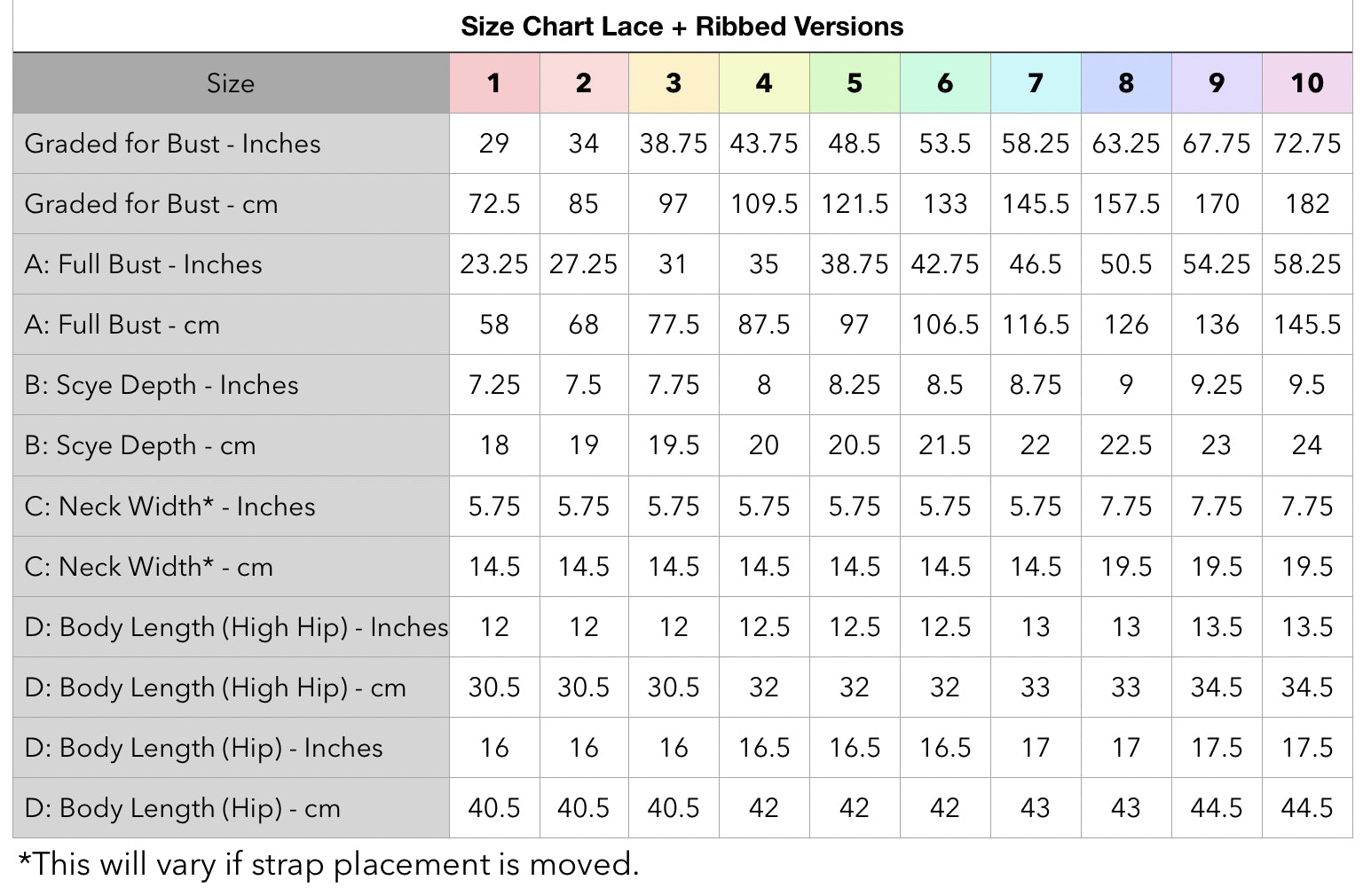 Note: Gauge plays a big role in how the camisole will fit. Even 1 stitch off in 4” / 10 cm will change the circumference significantly. If you have fewer stitches per 4” / 10 cm than the pattern gauge, choose a smaller size that will give you the recommended amount of negative ease at your gauge.