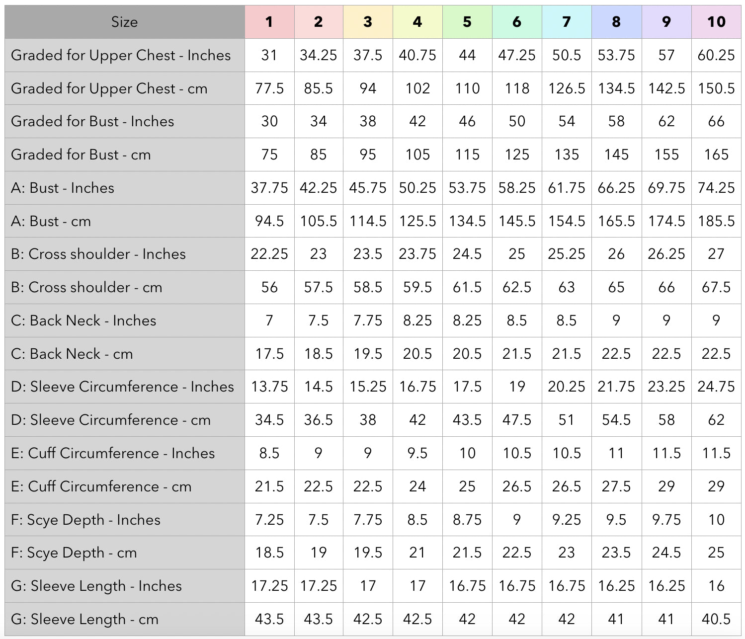 Choose the size graded for your Upper Chest measurement, or the one that will fit your shoulders best. If between sizes, size down.