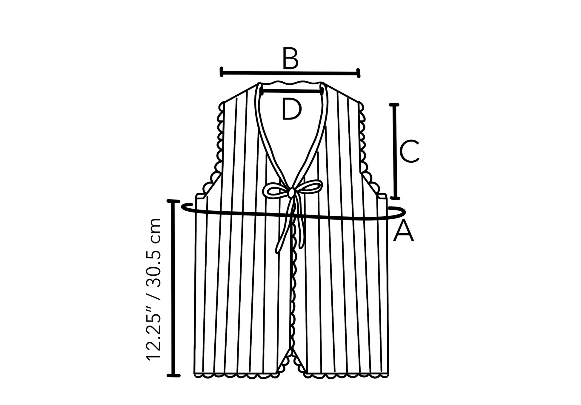 Please see the size chart and schematic in the photos for additional garment measurements. A-D are finished garment measurements.