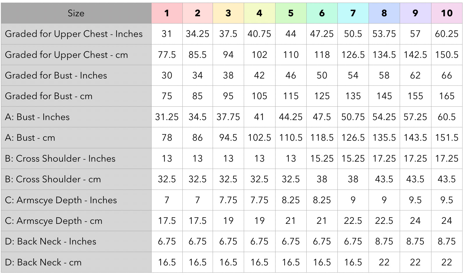 Graded to be worn with neutral ease at the upper chest (garment is the same circumference as your upper chest measurement). The cross shoulder measurement is intended to be close to your cross front measurement. See photos to see where the shoulders are meant to end on the body.