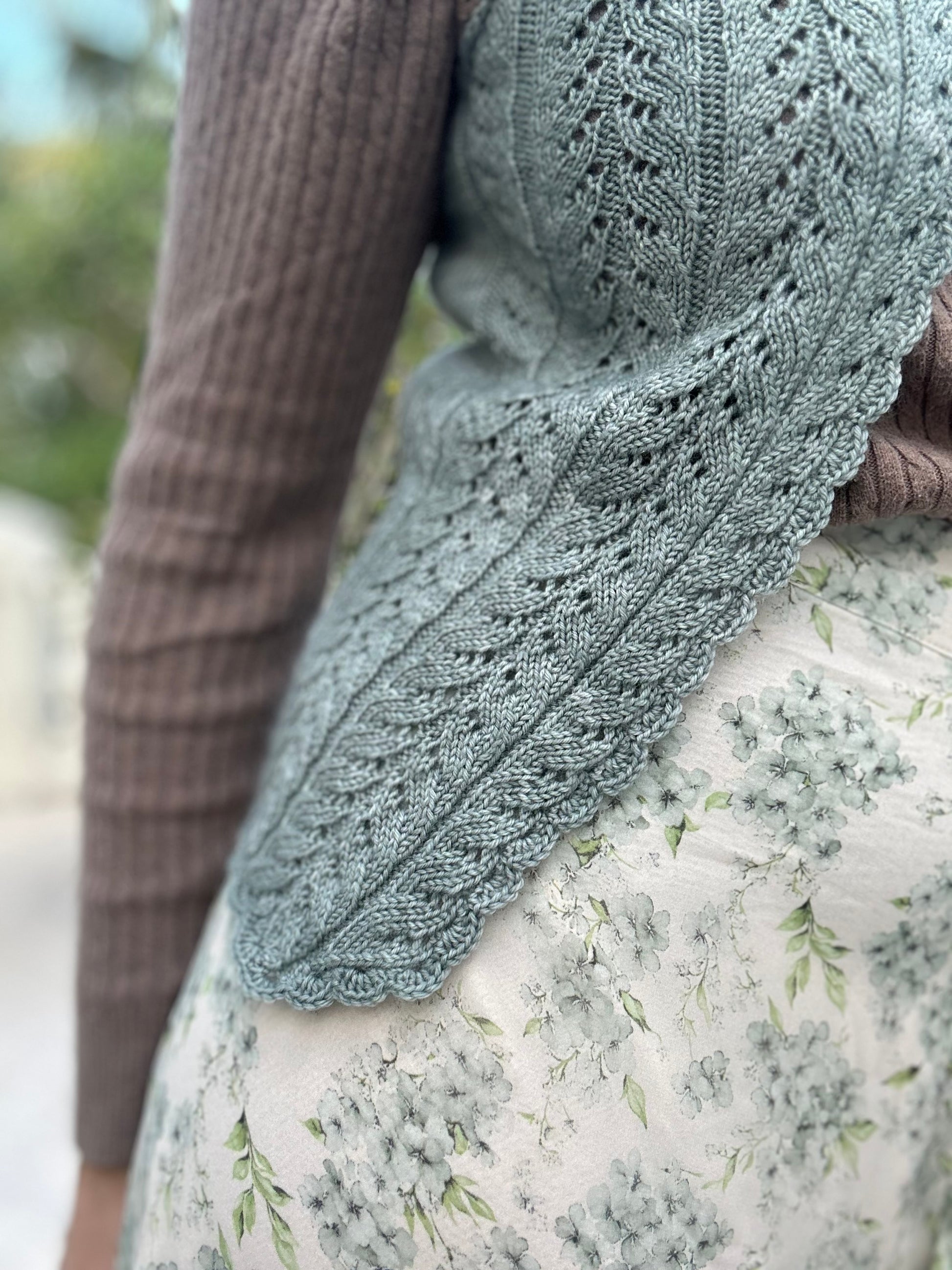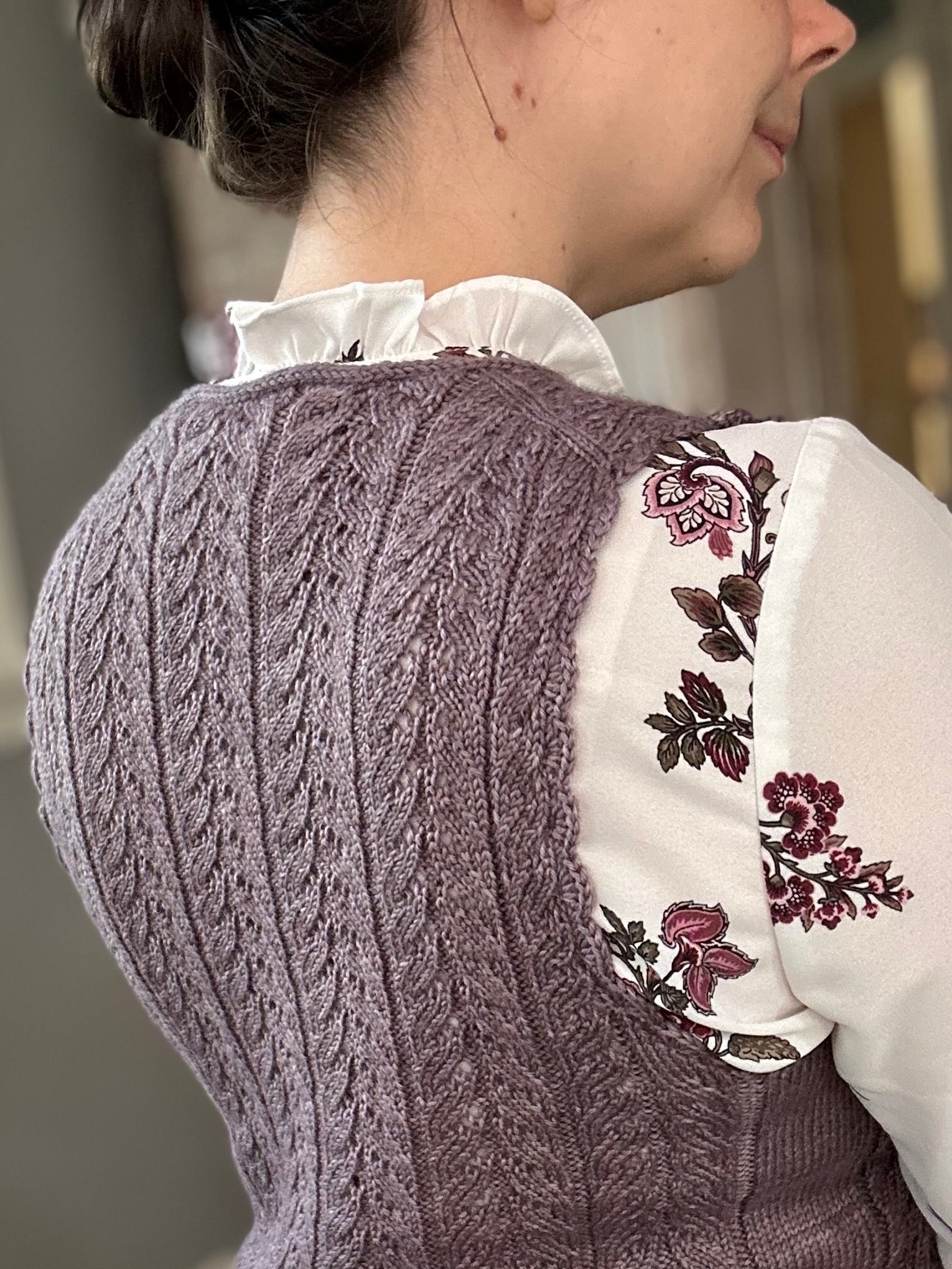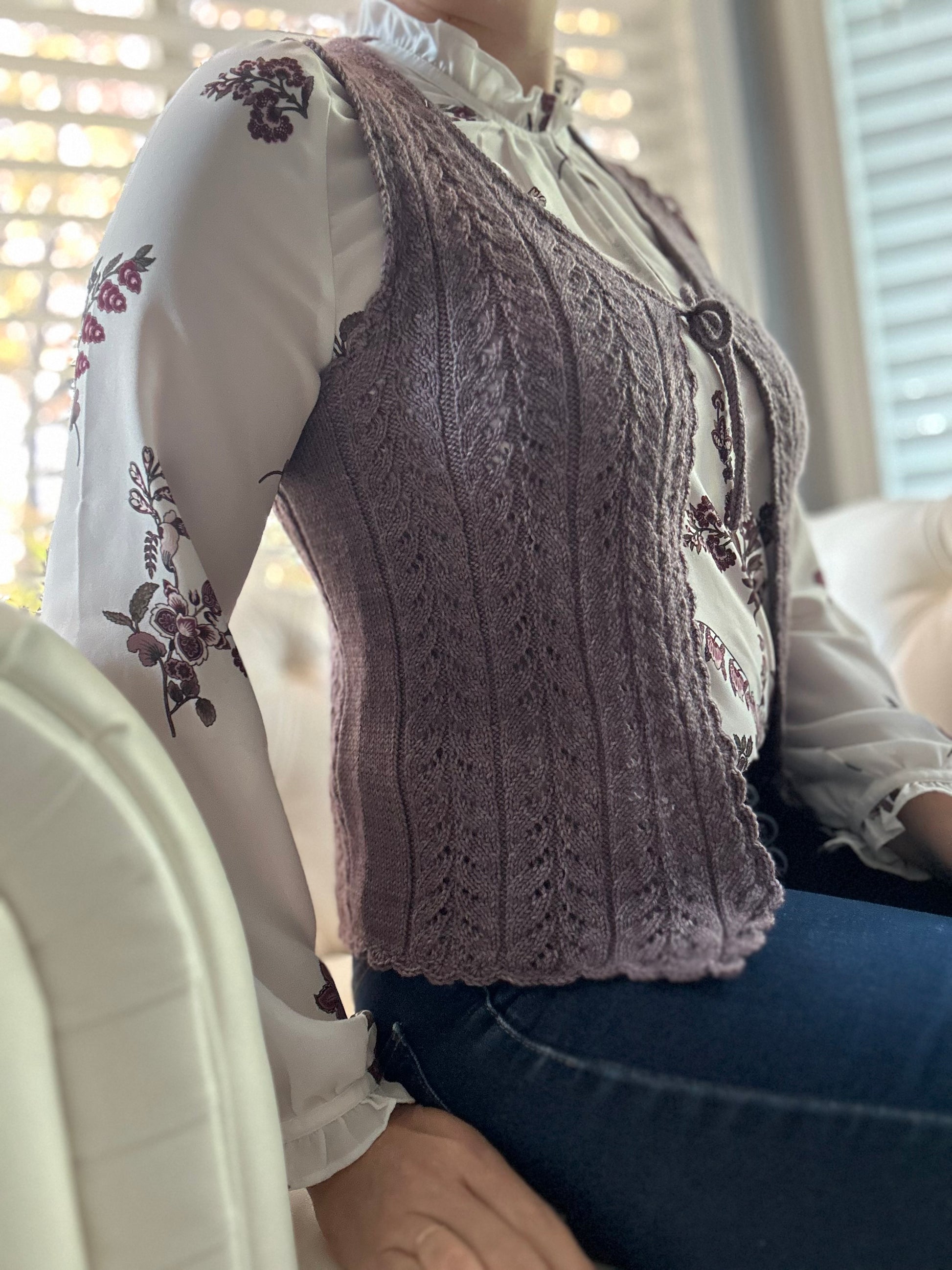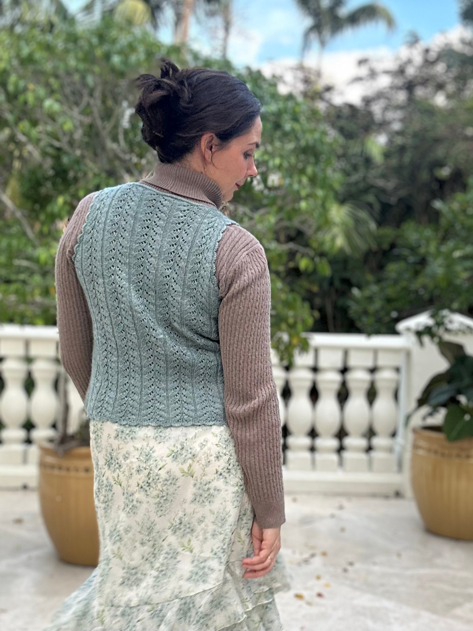 The Lace Whimsy Vest is worked from the top down using an English Tailored Shoulder construction. It is worked flat without seaming. The back is worked first, then stitches are picked up for the fronts, which then connect to the back with an underarm cast on. From then on the body is knit straight down, with optional bust short rows, ending with front notch shaping. Finally stitches are picked up to work the I-cord ties and trim around the neckline, and a crochet edging is worked around the armholes and body.