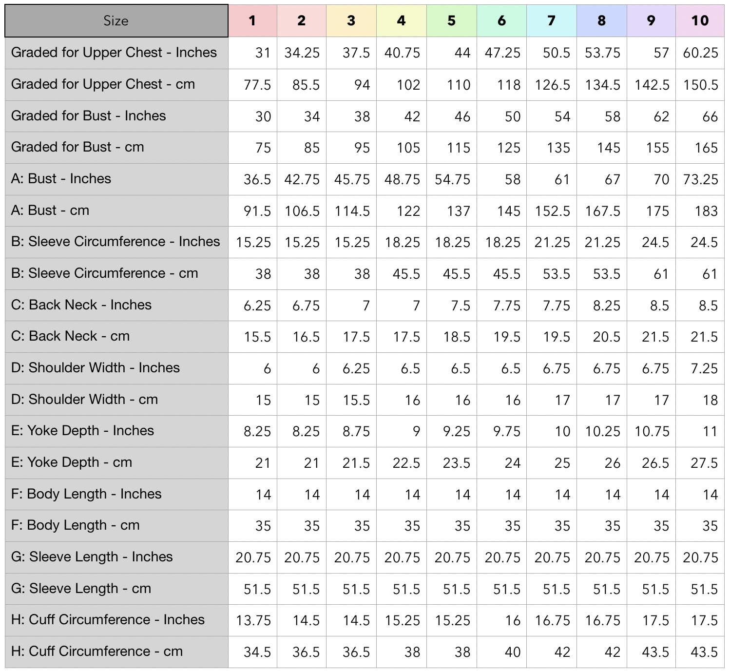 10 sizes graded to fit a full bust of 30” to 66” / 75 cm to 165 cm.
