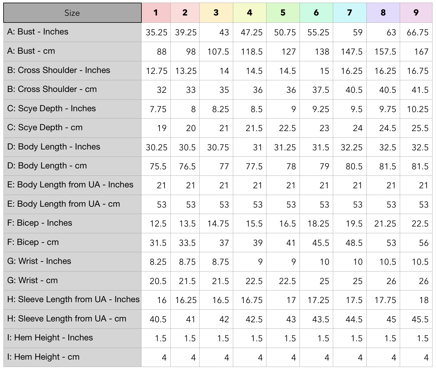 However, I recommend choosing the size with the cross shoulder measurement closest to your own measurement. Measure from shoulder bone to shoulder bone, not including the ball of your arm.