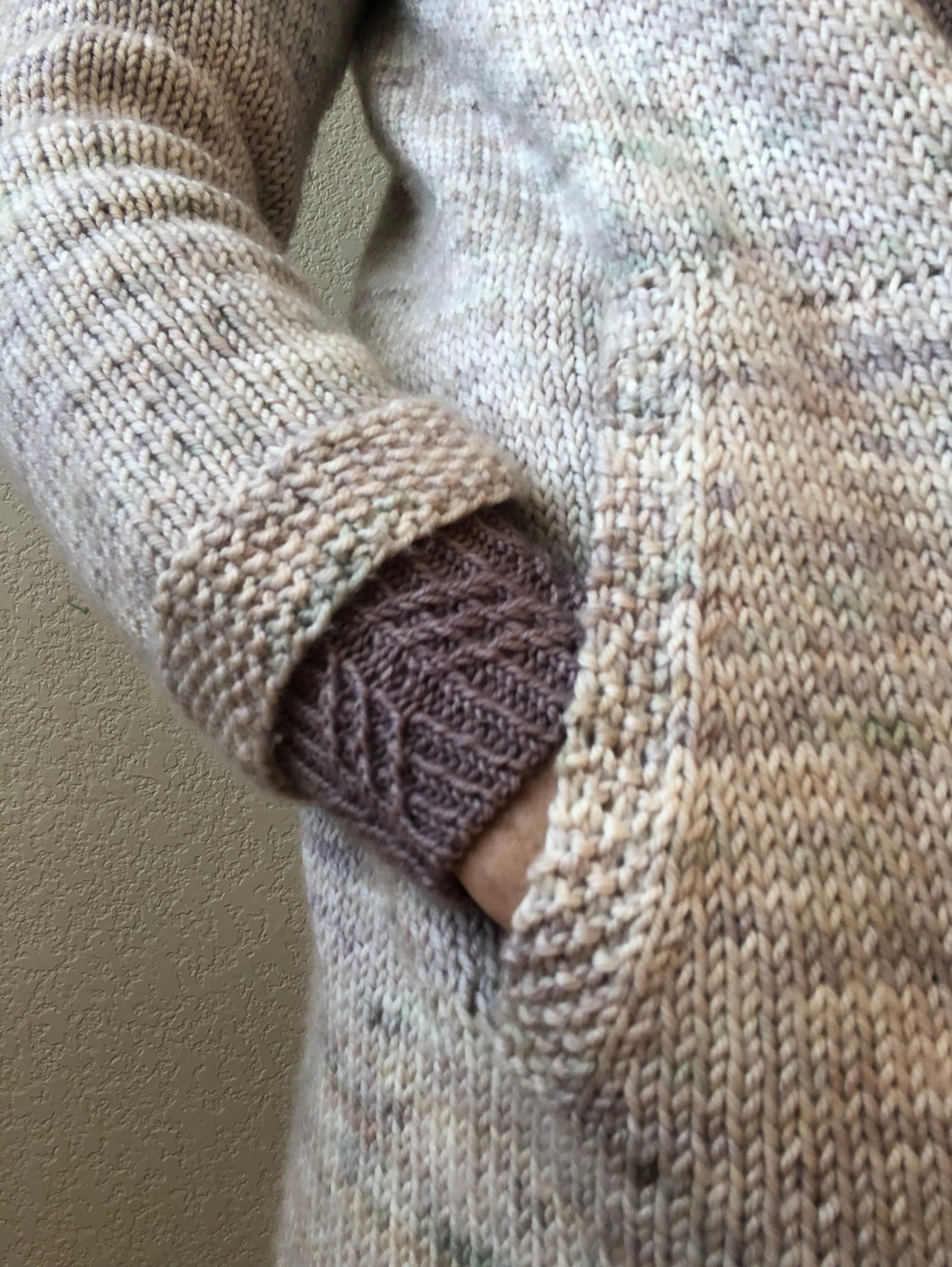 Construction: Knit top down, with shoulder short row shaping, a contiguous neckband, short row sleeve caps, bracelet length sleeves, and DEEP pockets! Pattern includes many photos and video links to help with the pocket construction. The only sewing involved is tacking down the sides of the pockets, which is done before knitting is completed.