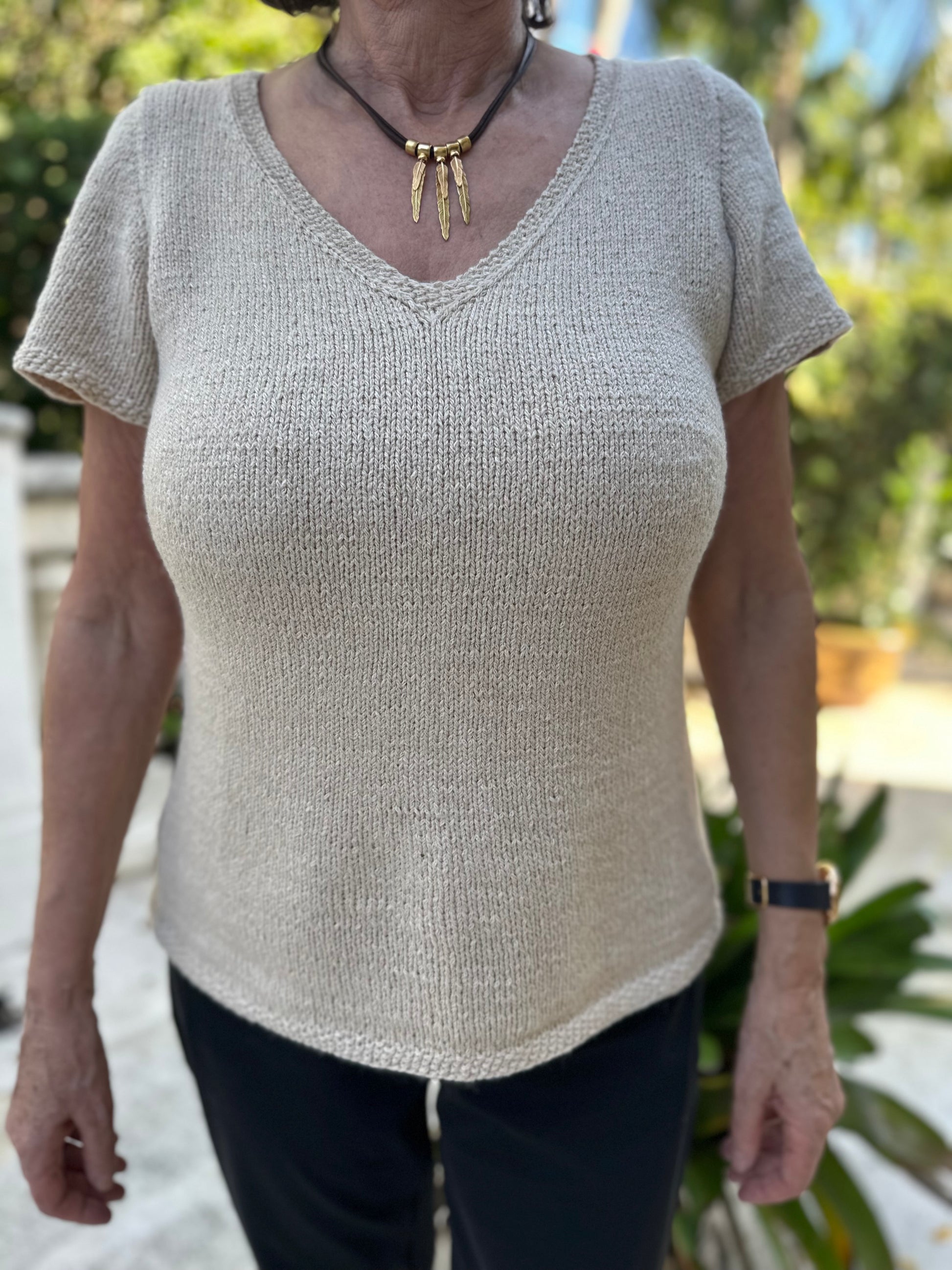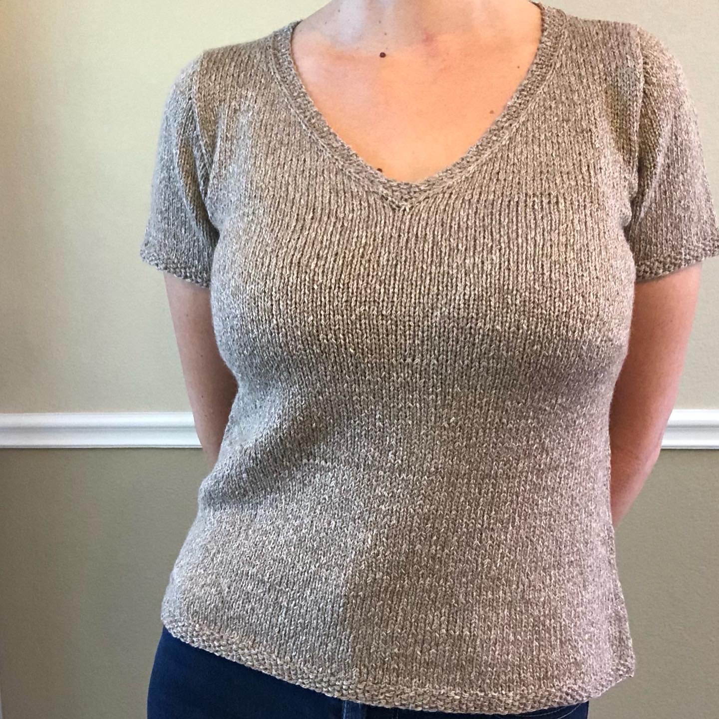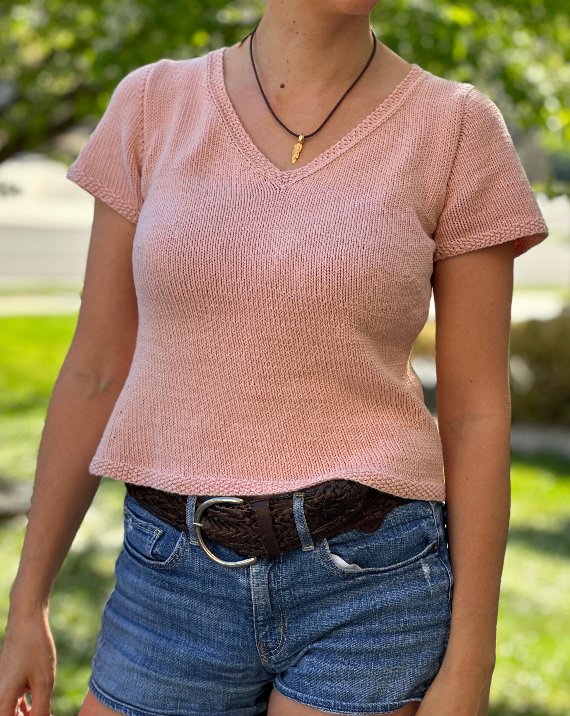 The Seedling Tee, easy to wear, and pair, that fits you just right. A project to be proud of, that makes you feel GOOD in it. A nice everyday V-neck set-in sleeve tee, the seed stitch trim giving it just a little bit of something extra. Pairs well with shorts, jeans, skirts, and as a layering piece under a cardigan.