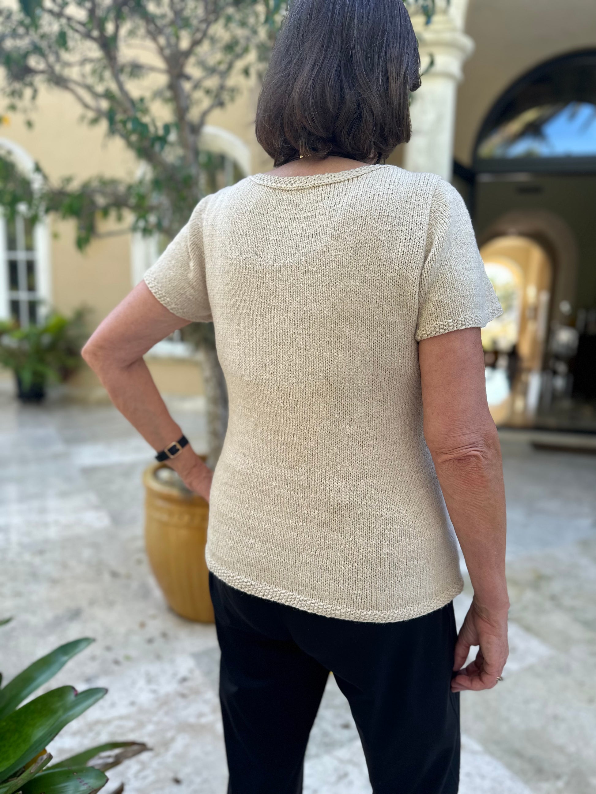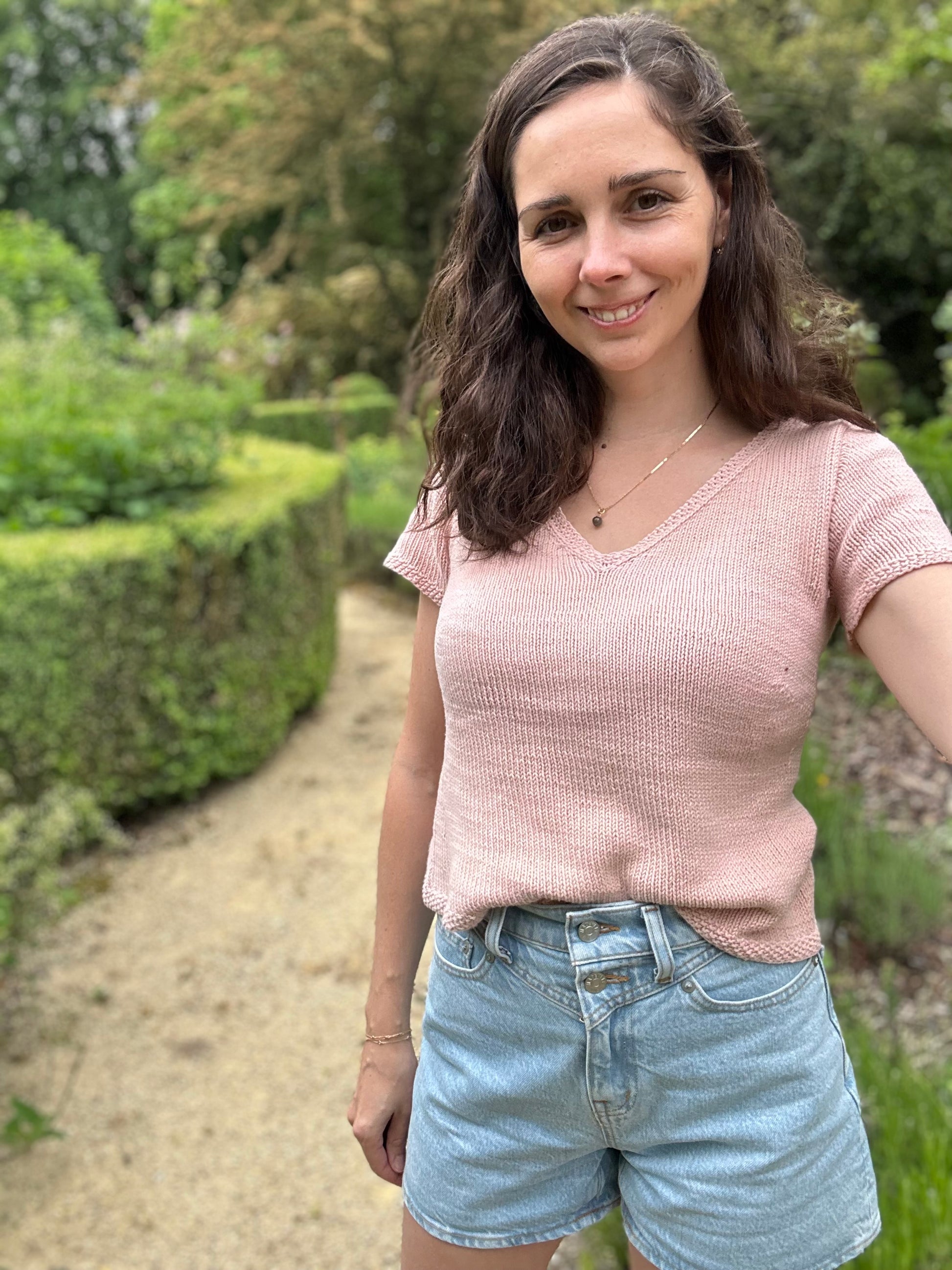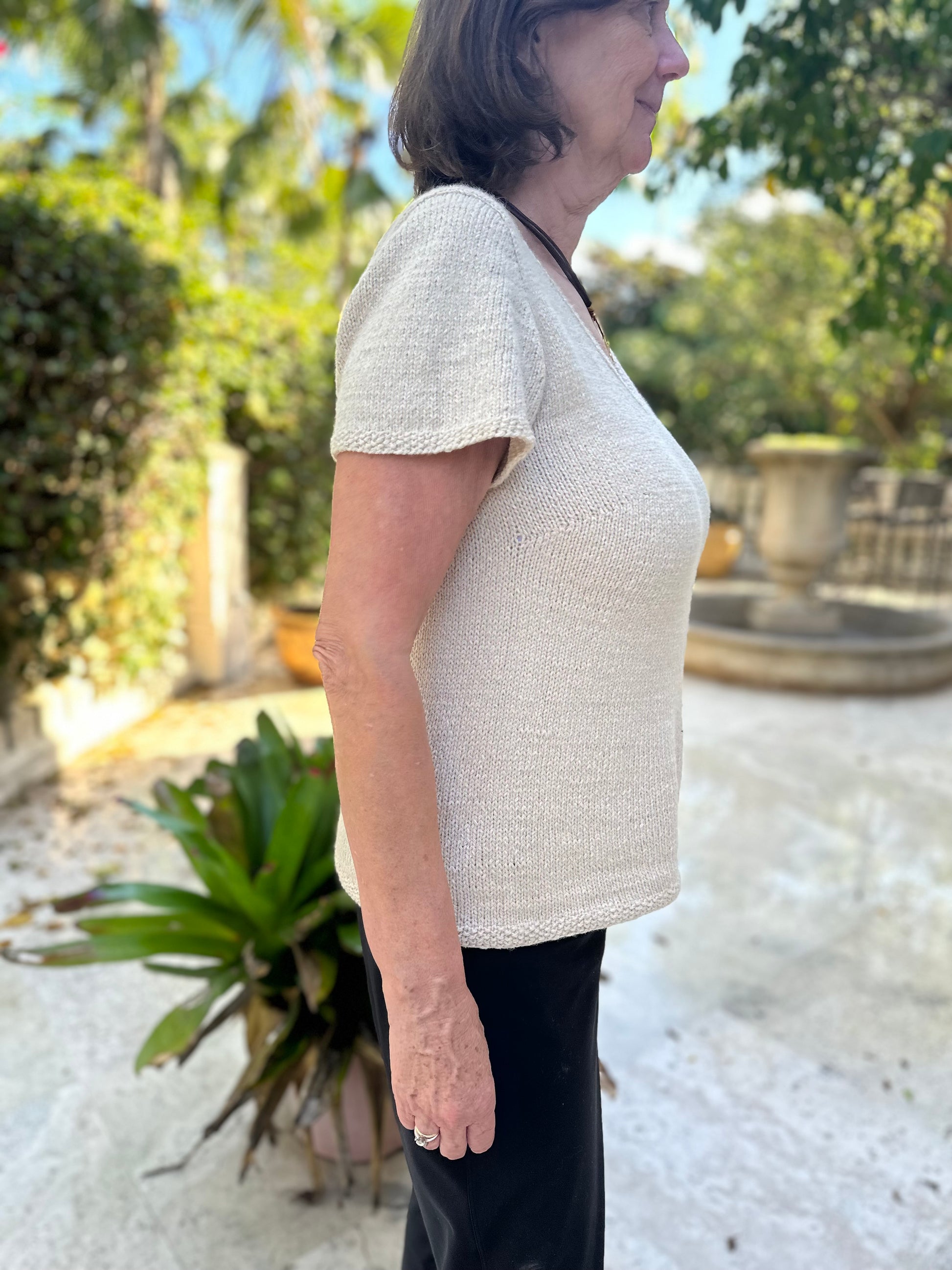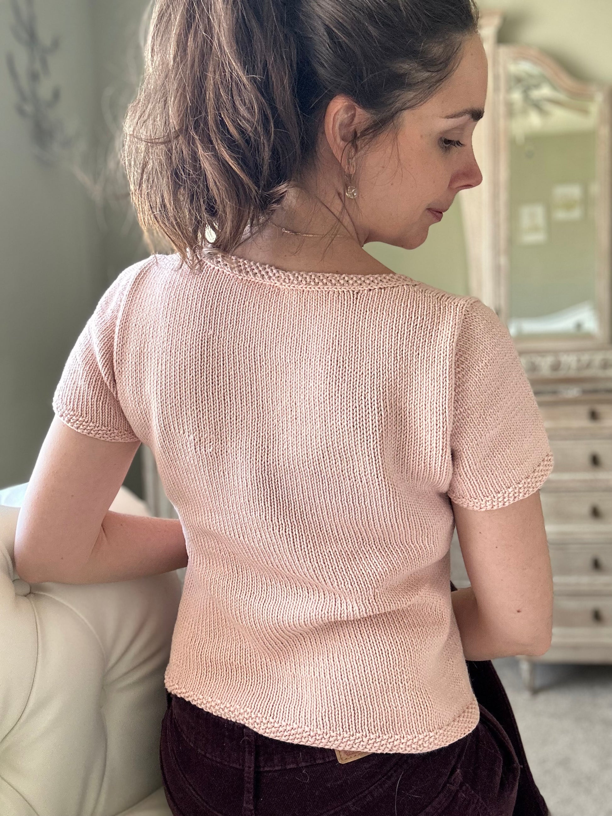 The Seedling Tee, easy to wear, and pair, that fits you just right. A project to be proud of, that makes you feel GOOD in it. A nice everyday V-neck set-in sleeve tee, the seed stitch trim giving it just a little bit of something extra. Pairs well with shorts, jeans, skirts, and as a layering piece under a cardigan.
