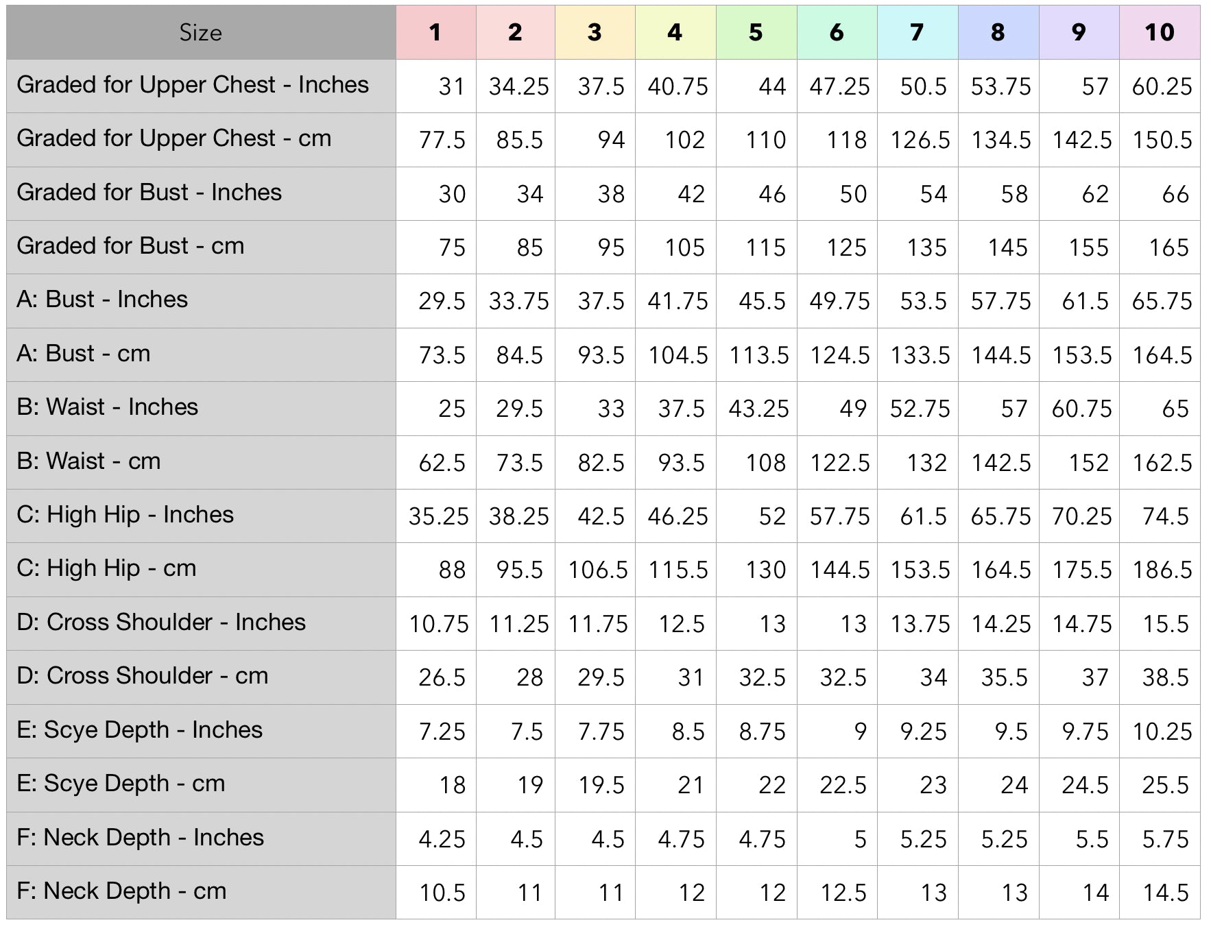 Please see the size chart and schematic in the photos for additional garment measurements, A-F are finished garment measurements. Pay special attention to D the cross shoulder measurement, it should be slightly narrower than your cross front measurement.