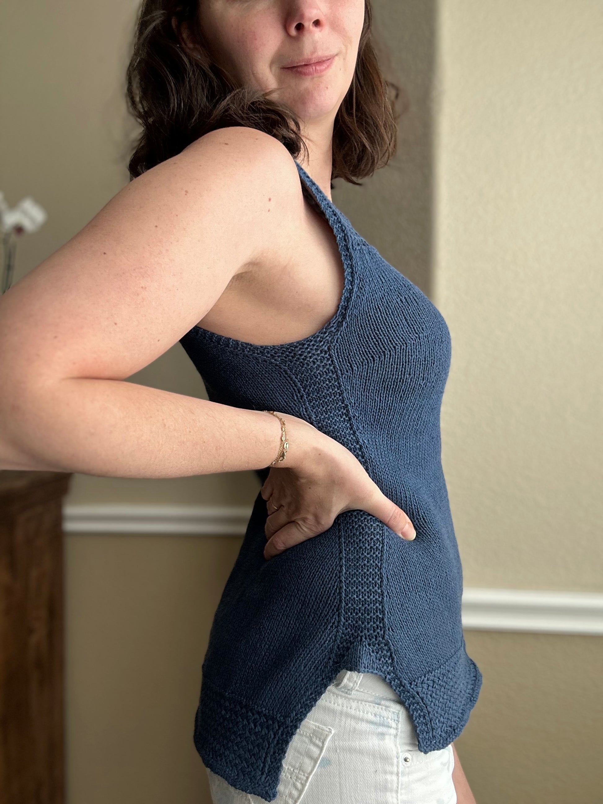 Kelbourne Woolens Mojave 4, 5, 6, (6, 7, 8) {8, 9, 10, 10} skeins (185 yards / 169 meters per 50 g), 60% Pima Cotton, 40% Linen, in ‘Deep Blue’.