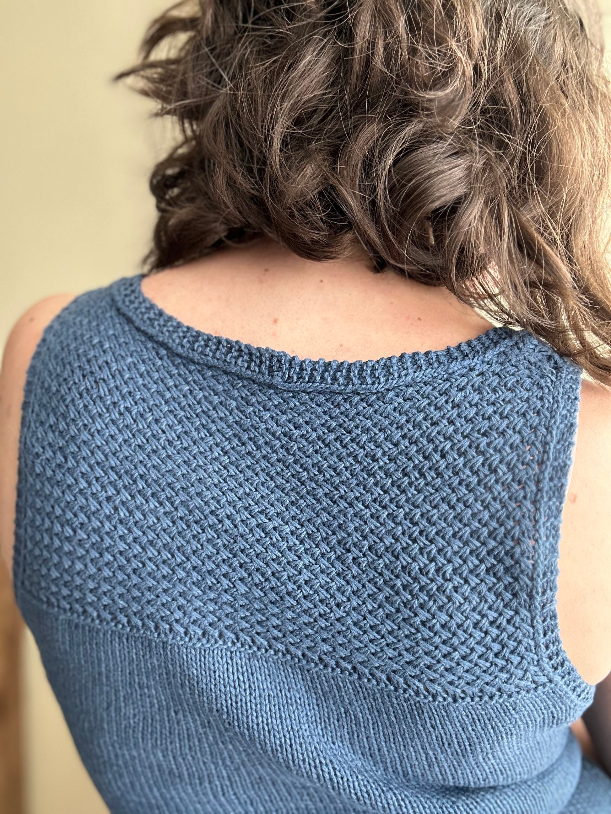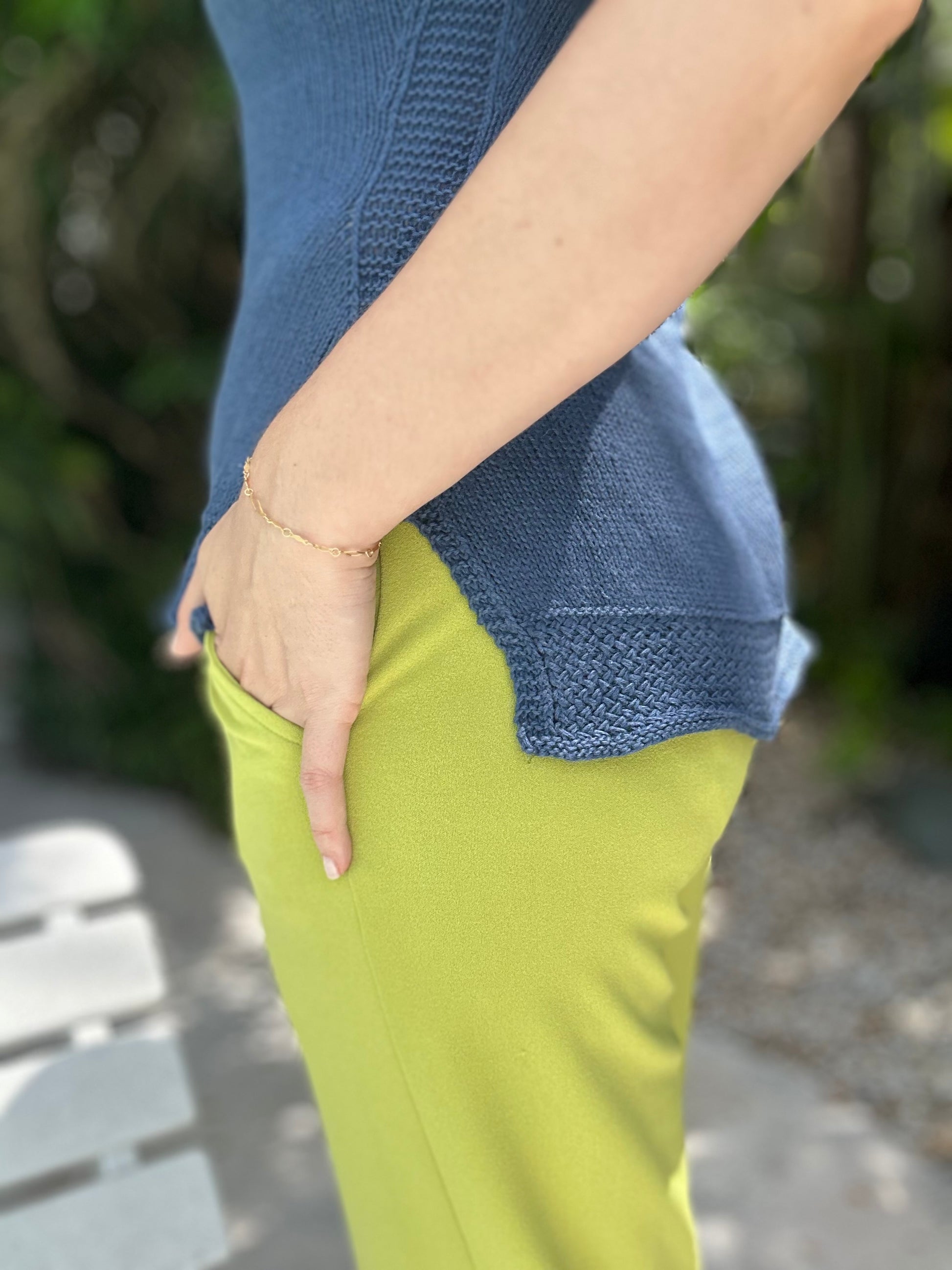 Delight in this well fitting, figure skimming, feminine summer staple. The wicker stitch details add interest to the knitting experience, and create a lovely breathable fabric. The summery linen blend yarn is a perfect match, with stunning stitch definition and gorgeous drape.